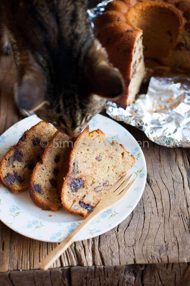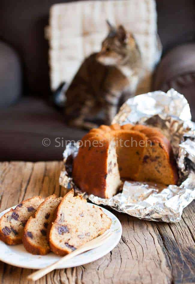I knew I had overfilled my Bundt tin just a bit but figured it might just hold. I had to restrain myself from sitting in front of the oven for an hour watching the cake rise and seeing what was happening! But I cannot complain really. Call it beginners luck but the cake turned out completely perfect. Moist on the inside, deliciously crispy on the outside. Not too sweet with just the hint of the almond flour and the burned butter coming through. Maybe add a tiny bit more cinnamon for next time but man, I am so thrilled with this recipe!