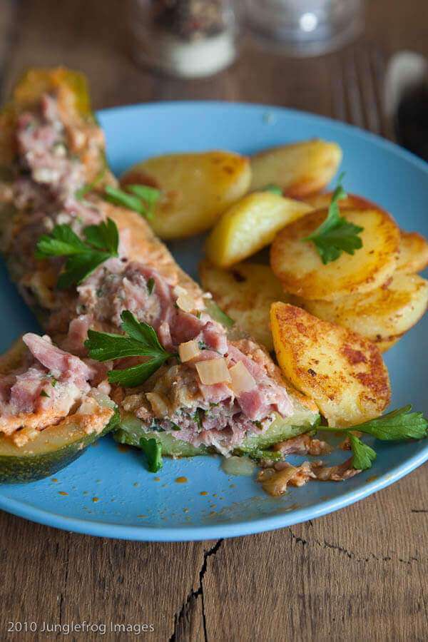 - Mix ham, parsley, garlic, half the pancetta, the ground beef, the parmesan and the egg into a bowl with salt and pepper to taste. With a little sharp knife (or use a spoon) cut out the meat from the courgette but make sure to leave the shells intact. Fill them with your meatmixture.