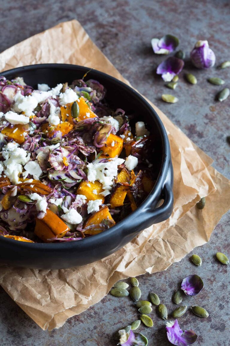 Brussels sprouts salad with pumpkin and feta