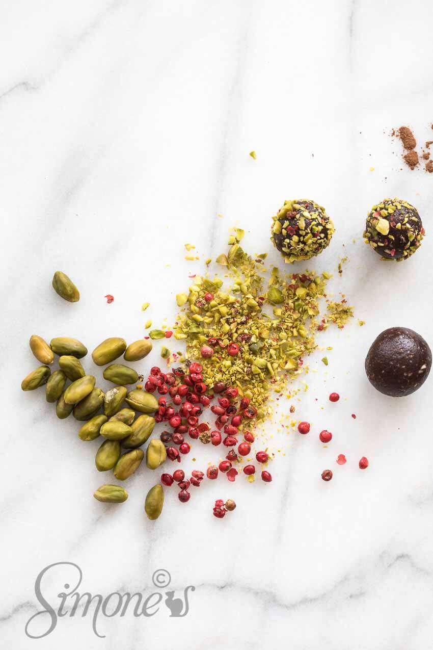 - Chop the pistachio and the szechuan finely and mix it. Roll each ball through the nut-pepper mix and push a little if necessary.