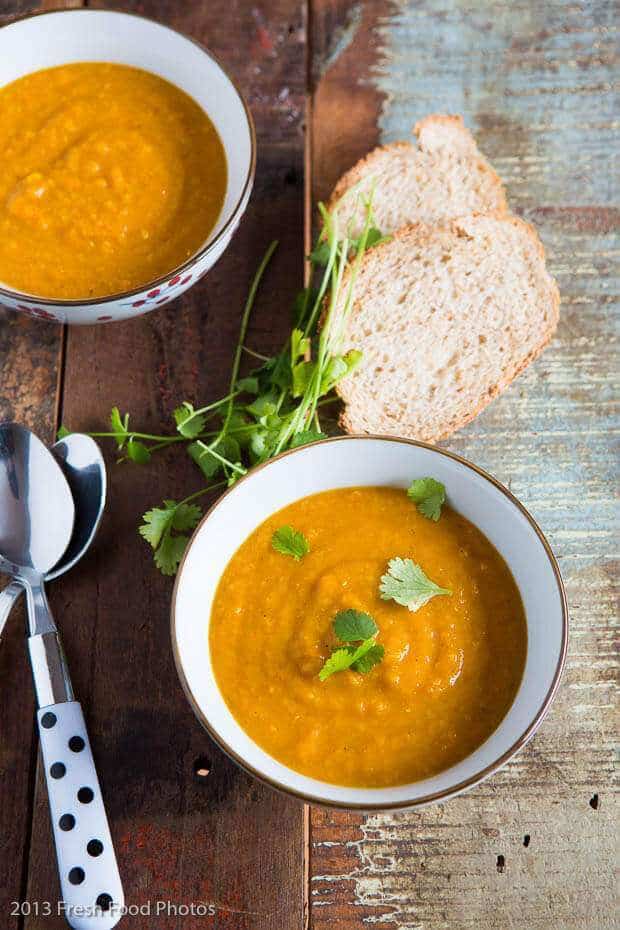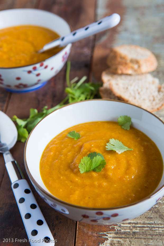 - Using a hand blender or in a food processor, blitz until as smooth as you like. Season and serve scattered with roughly chopped coriander and some naan bread alongside.