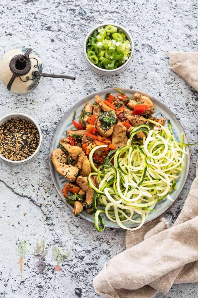 - Serve with courgette noodles, the spring onions and sesame seeds