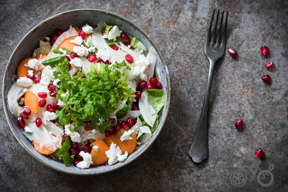 I’ll maybe share more on that in the near future, but for now I have this delicious fennel salad with pomegranate and goat cheese. And a small bunch of chervil on top. Quick, delicious and good for you! Especially in the coming month where there is probably an overload of not so healthy food, a good salad for lunch might keep you going! 🙂