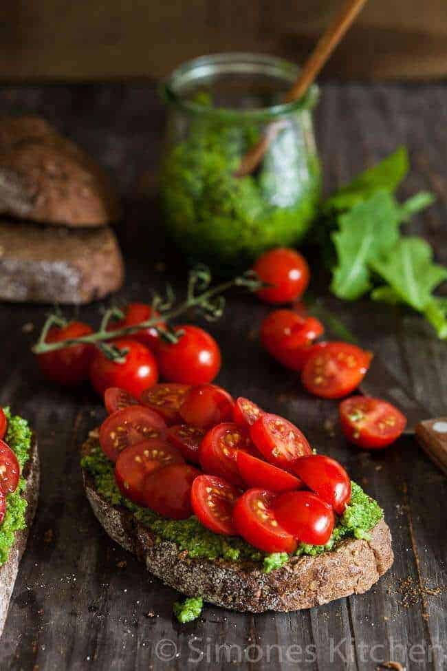 I’m having a day of today and ofcourse – as that always seems to happen this summer – it is raining cats and dogs all day. I don’t really mind as I am spending my time baking my first ever bagels.. Bagels that will definitely taste fabulous with this spicy pesto! I wanted to try different flavors in my pesto and I love making it with rocket. The taste is more bitter then what you’re used to when making it with basil but I love it. Because of the strong goatcheese I used to pair this with you really want to eat it with something juicy and fresh such as lovely tomatoes. You’ll need that to counterbalance the strong taste a little bit. Ofcourse you could also just add a bit less of the cheese but I like it strong.
