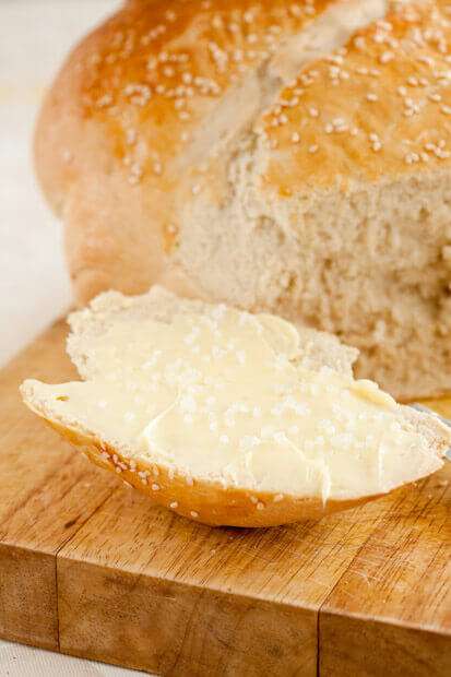 - Preheat the oven at 220 ° C (400.˚F) Mix the egg white and the salt and put some on top of the bread. Sprinkle with the sesame seed and cut with a sharp knife over the top of the bread. Bake the bread for 20 minutes and put the temperature down to 180 °C and bake for another 10 minutes until it sounds hollow when you tap the bottom of the bread. Leave to cool on a wire rack.
