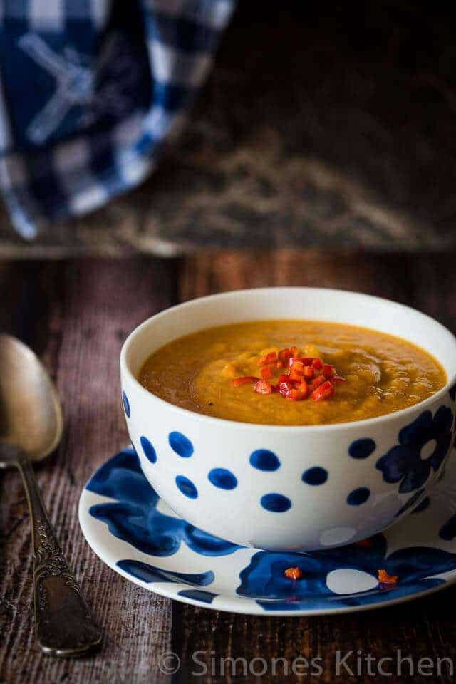 Traditionally you might opt for the butternut squash as that is usually the pumpkin that is most readily available. I would urge you to not do that though for this soup. I used a blue pumpkin which is ridiculously hard so a bit tough to cut, but so tasty!