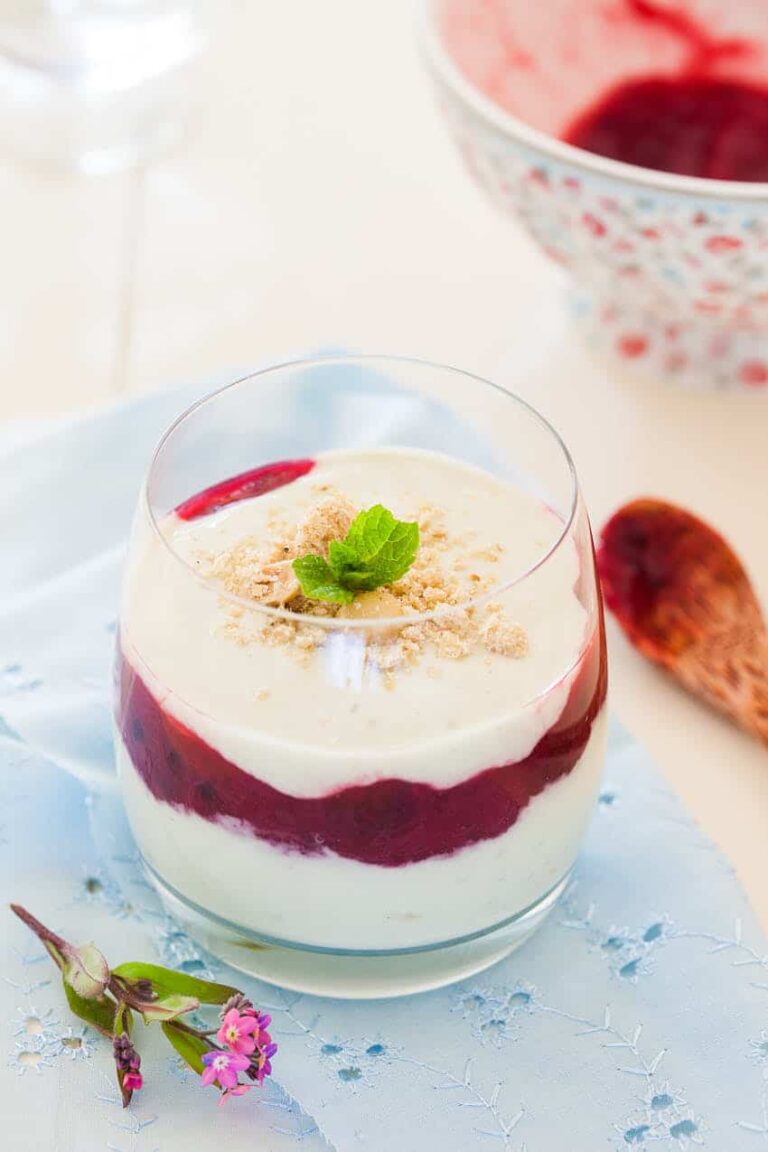 The subtle flavor of the matcha yogurt is combined with sweet and tangy rhubarb and blackberry puree, to make a super easy and delicious dessert. You can add more or less matcha if you prefer. The yogurt itself doesn’t color overly green depending on how much you place in it. Serve with some hazelnut crumble to top it off.
