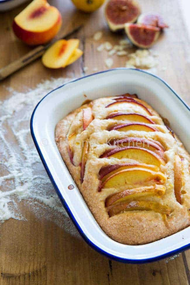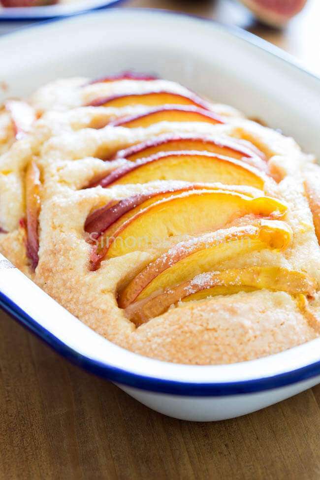 - Preheat the oven to 160 C. Mix butter, almondflour, eggs, lemonzest, flour and sugar into a bowl. Divide across 4 lightly greased forms or one larger one. Press the nectarine slices into the mixture and sprinkle with a bit of sugar. Bake in around 30-35 minutes golden brown.