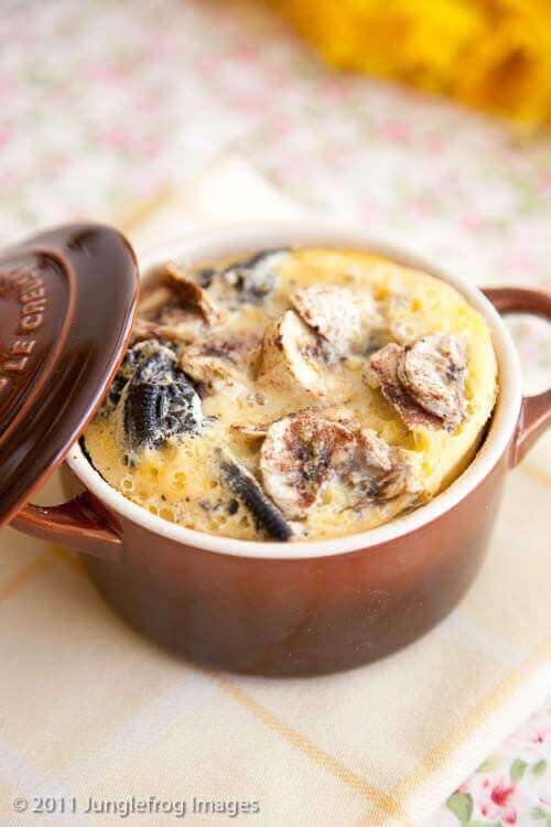 - Place 4 to 6 ramekins in a deep baking dish. Pour the custard into the ramekins, filling them just below the rim. Add 1 tablespoon of crushed Oreo cookie crumbs into each ramekin.