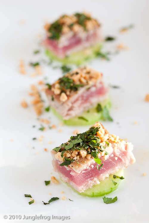 - Cut the tuna into cubes or rectangles of about 10 gram each and put them on the cucumber slices. Cover with some of the sauce, top with the peanuts and last with the cut herbs. Serve immediately.