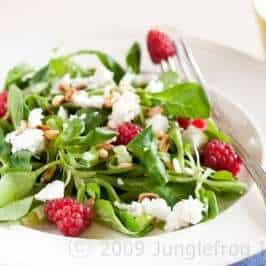 - Roast some pinenuts in a dry frying pan and keep aside to cool of. Make a dressing out of balsamic vinegar and olive oil (1 part vinegar to 3 parts oil) and season with salt and pepper to taste. Toss some lamb's lettuce on a plate and add some chopped spring onions on top. Add crumbled goatcheese, raspberries and the pinenuts and drizzle some of the dressing on top.
