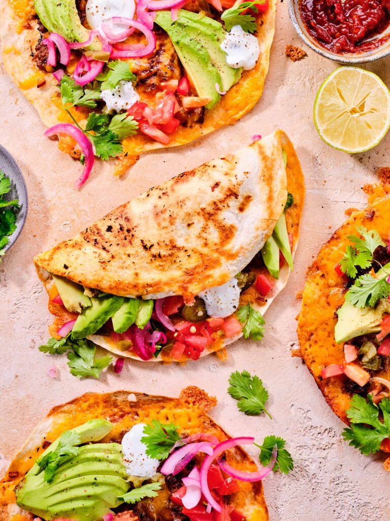 You start by seasoning the ground beef. once that is done you spread 1/4 of the beef on one tortilla side. Make a thin layer of ground beef and heat a large skillet with some olive oil. Now press the tortilla down in the hot pan with the beef side down. Use a spatula or similar to press it down while cooking so the beef browns nicely and cooks through.