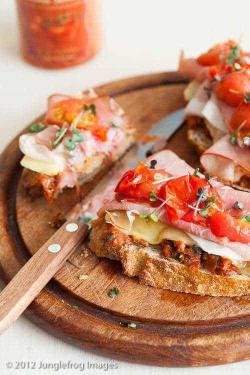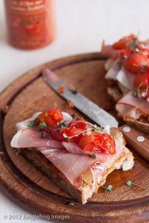 - Remove the bread once the cheese is melted and leave the tomatoes until the skin cracks. Line your melted cheese with a few slices of prosciutto (or other ham) and add a few of the grilled tomatoes. Sprinkle with some mustard cress and you’re done!
