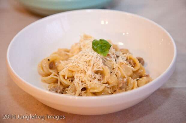 - Put the chopped onion, butter and vegetable oil in a small saucepan. Turn the heat to medium and cook until the onion becomes colored a pale gold, Add the crumbled sausage and cook for 10 minutes. Add a few grindings of pepper, all the cream, turn the heat to medium high and cook until the cream has thickened, stirring once or twice. Taste and correct for salt.