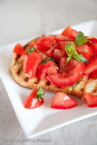 It amazes me every single time how much flavor you get by simply rubbing a clove of garlic over a toasted piece of bread! The recipe said to spread the garlic over the bread but I tend to find that a bit too overpowering so I rubbed half a clove of garlic over the fresly toasted bread, sprinkled it with olive oil and put the tomatoes on top. Key in this recipe is to use good tomatoes. You do not want the watery type. That will just kill the taste of the bruschetta. So nice tomatoes, whatever variety you have in your area and remove the seeds for the most part and chop them in small pieces, mix with fresh basil and put on top of your warm toasted bread. Add some salt and pepper and you’re done!