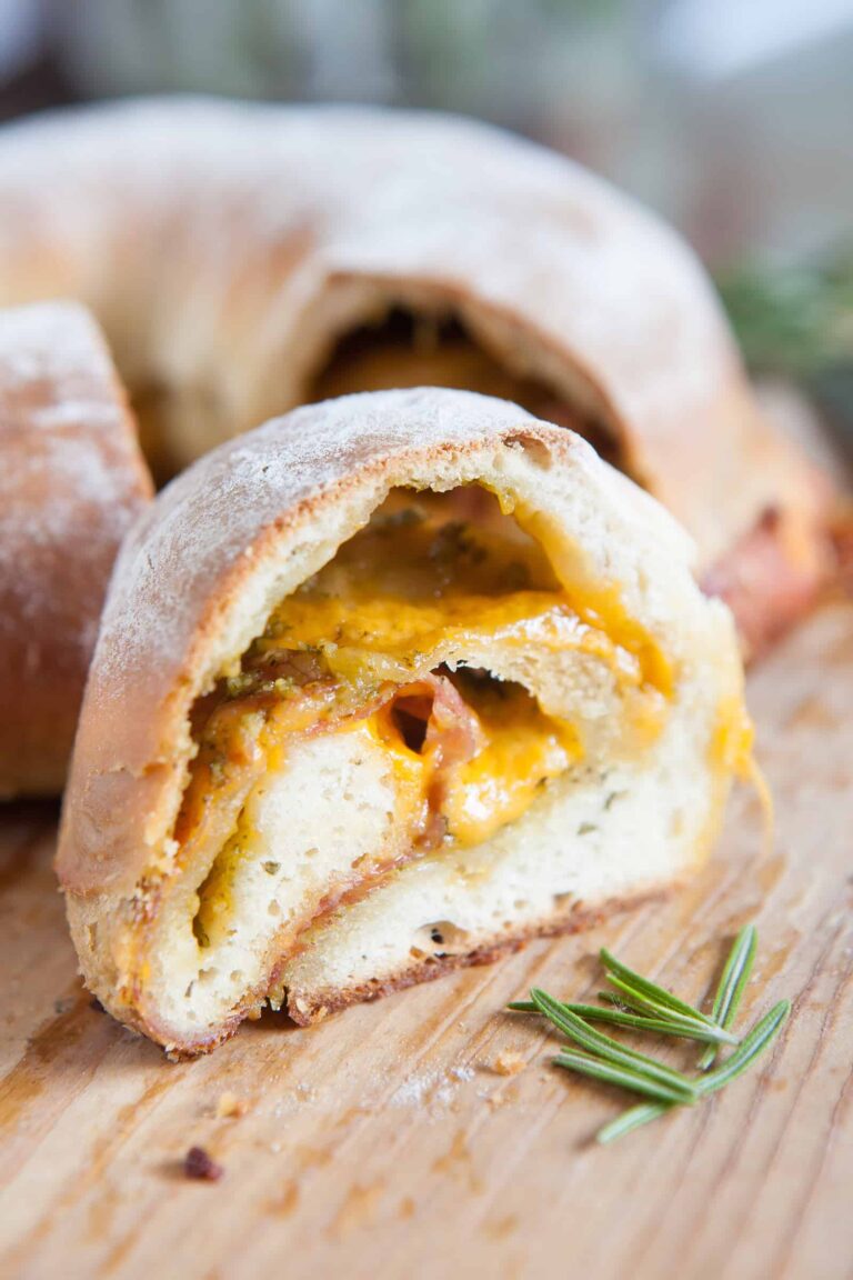The tortano comes from the area around Napels and is shaped in a ring. Apparently it looks a bit like a tart, hence the name tortano. Like a pie you also cut it into similar pieces. Leila tells us that originally the bread is stuffed with boiled eggs but you can of course add anything to the filling. Leila gives 9 examples of fillings but I chose to do another one, with the things I had on hand. I added some herbs into the dough itself and then filled it with the homemade pesto I had made earlier in the week, some leftover salami and a rich cheddar.