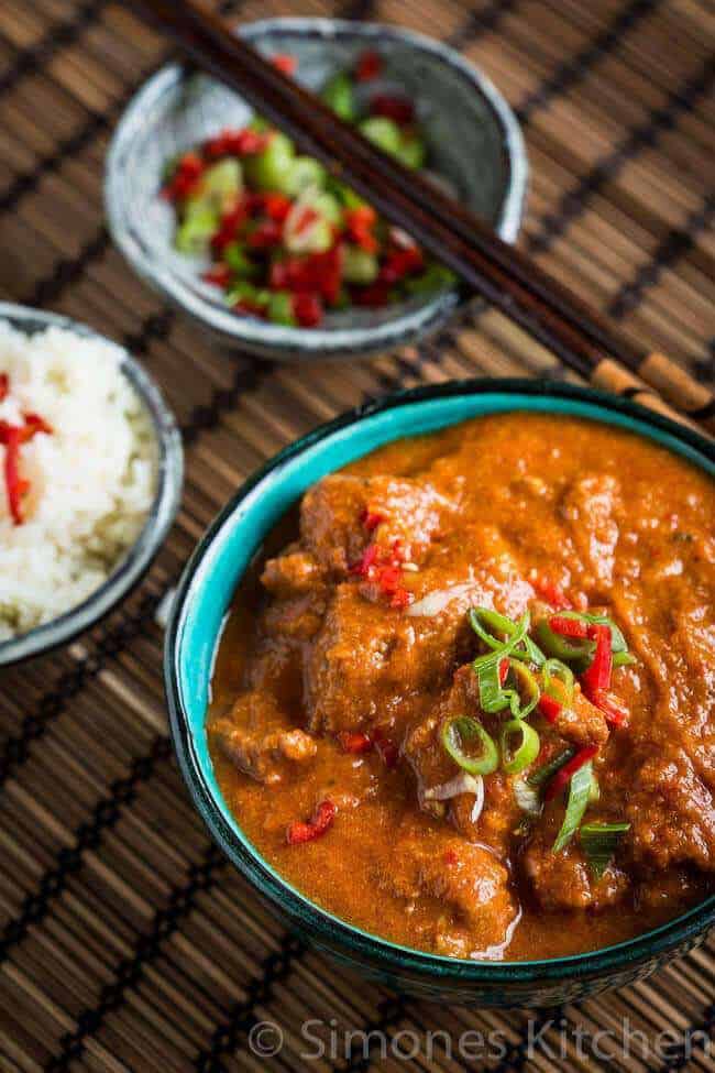 It feels like it’s been forever since I last made this recipe. I was cooking up a storm together with my friend Esmee from the blog Es Factory and one of the dishes we were making was these pulled pork buns I showed you earlier. Insanely good of course, but when you have to buy a piece of meat of 2,5 kilo you just know that is not going to fit in your fairly small slowcooker. Plus making 2,5 kilo of pulled pork might be a bit too much (or maybe not…lol) And Es being the queen of vindaloo suggested we make this with the other half of the meat.
