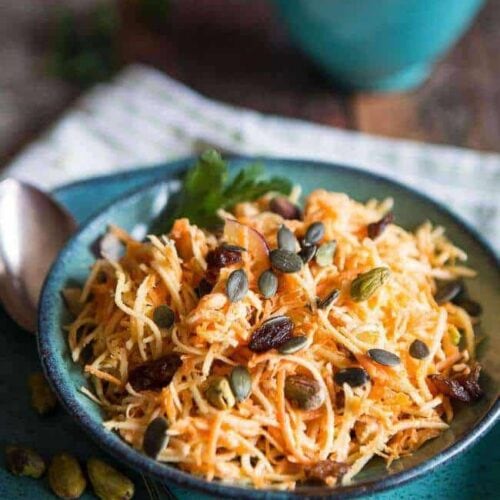 Once the celeriac and the carrots are grated put them in the bigger bowl. Add the chopped onions, the raisins and the pumpkin seeds. Chop the nuts and add as well. Make a dressing of the olive oil, the vinegar, mustard, mayonaise and the lime juice. Add salt and pepper to taste.
