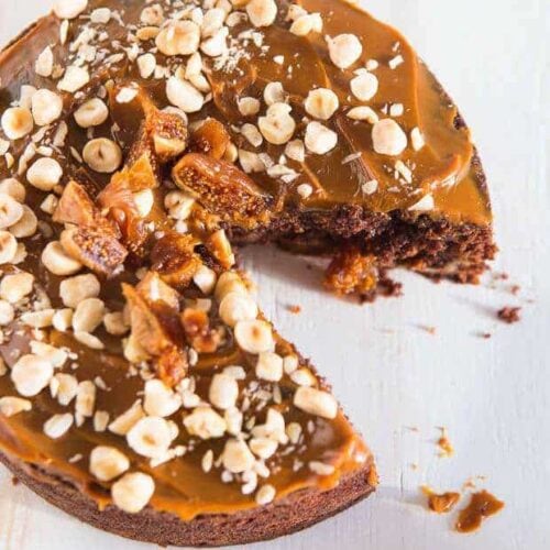 Spread a layer of dulce de leche over the top of the cake once it is cooled and sprinkle the top with hazelnuts and dried figs.