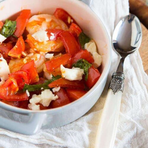 Ad the diced tomatoes and basil to the frying pan and season with pepper. Cook for a couple of minutes until the tomatoes are warmed through then spoon over the prawns. Add a few pieces of feta to each saganaki, or tuck them in among the prawns if you're using one large pan. Transfer to the oven for 5 minutes until the cheese begins to soften. Take to the table to serve.