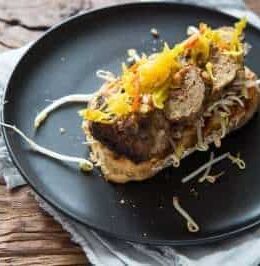 Take the meatballs from the pan and cut each in 4 to 5 slices. Put them on the prepared sandwich. The melted peanutbutter core should ooze out of the meat. Finish each sandwich with a tablespoon of pickled vegetables.