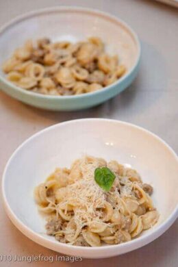 Put the chopped onion, butter and vegetable oil in a small saucepan. Turn the heat to medium and cook until the onion becomes colored a pale gold, Add the crumbled sausage and cook for 10 minutes. Add a few grindings of pepper, all the cream, turn the heat to medium high and cook until the cream has thickened, stirring once or twice. Taste and correct for salt.