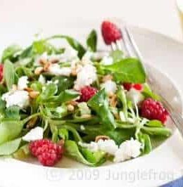 Roast some pinenuts in a dry frying pan and keep aside to cool of. Make a dressing out of balsamic vinegar and olive oil (1 part vinegar to 3 parts oil) and season with salt and pepper to taste. Toss some lamb's lettuce on a plate and add some chopped spring onions on top. Add crumbled goatcheese, raspberries and the pinenuts and drizzle some of the dressing on top.