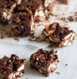 Prepare a baking tin with baking paper and pour the mixture in. Use a spoon to press it as firmly as possible into the tin and put into the fridge for a minimum of four hours