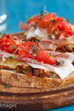 Remove the bread once the cheese is melted and leave the tomatoes until the skin cracks. Line your melted cheese with a few slices of prosciutto (or other ham) and add a few of the grilled tomatoes. Sprinkle with some mustard cress and you're done!
