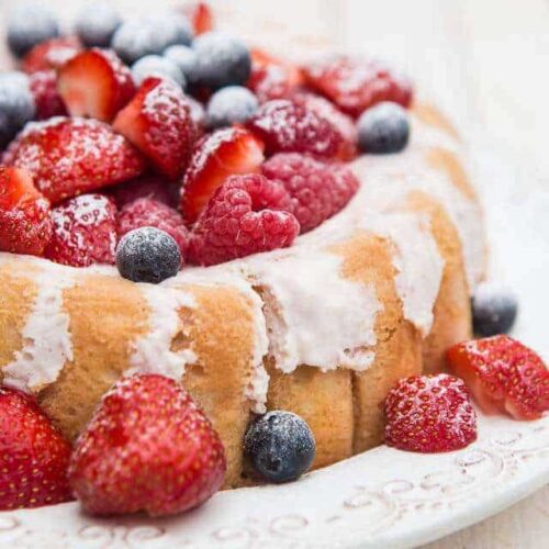 As soon as it is set properly put a plate on top of the mould and turn it upside down together. Remove the mould and the clingfilm. Garnish the charlotte with strawberries, raspberries and blueberries and dust with icing sugar
