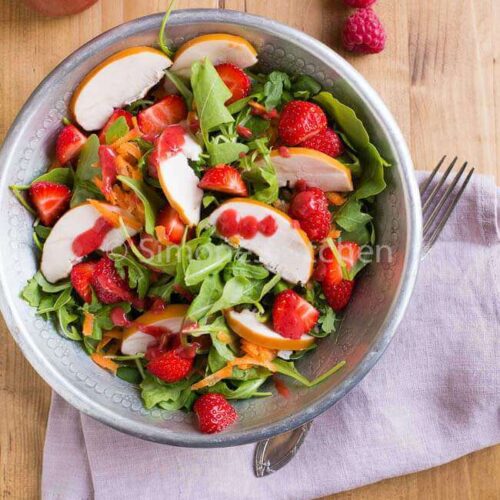 Cut the chicken in slices or cubes. Wash the strawberries and cut them in halves if small or quarters if they are bigger. Grate the carrots and squeeze some orange juice over them and set aside until you're ready to assemble the salad.