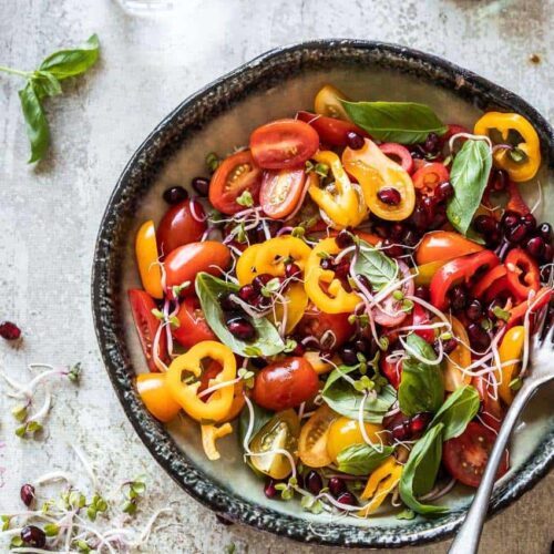Cut the tomatoes in small pieces and the bell peppers too. Add to a bowl and mix with the pomegranate