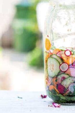 Place the carrot, cucumber, radish, beetroot and salt into a colander on top of a bowl and toss to combine. Allow to stand for 20 minutes before rinsing under cold running water. Drain well and set aside. Place the vinegar, sugar and water in a large jar and stir until the sugar has dissolved. Add he mustard seeds, fennel seeds, peppercorns, parsley, dill and vegetables and stir to combine. Refrigerate for at least 20 minutes before serving with the burrata and sourdough. Serves 4.