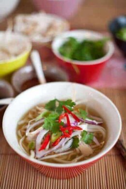 Taste the broth and add more fish sauce or sugar, if needed. Strain the broth and discard the solids.
