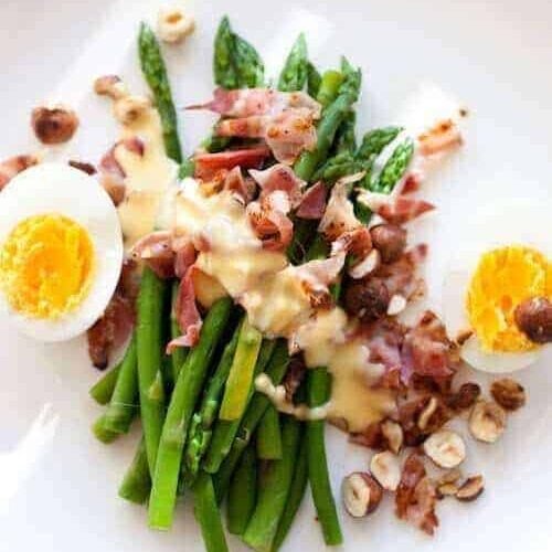 Just before serving, put the nuts and bacon into a warm oven. Halve the eggs and season. Bring a pan of salted water to the boil; cook the asparagus for about 5 mins, until just tender. Drain, then divide between plates. Add egg halves, sprinkle with nuts and bacon, then drizzle with dressing in a zigzag pattern.